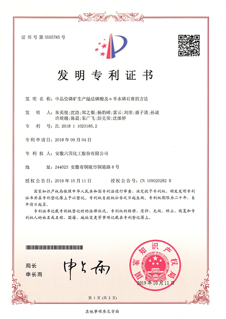 • 2019年中品位磷礦生產濕法磷酸及α半水磷石膏的方法