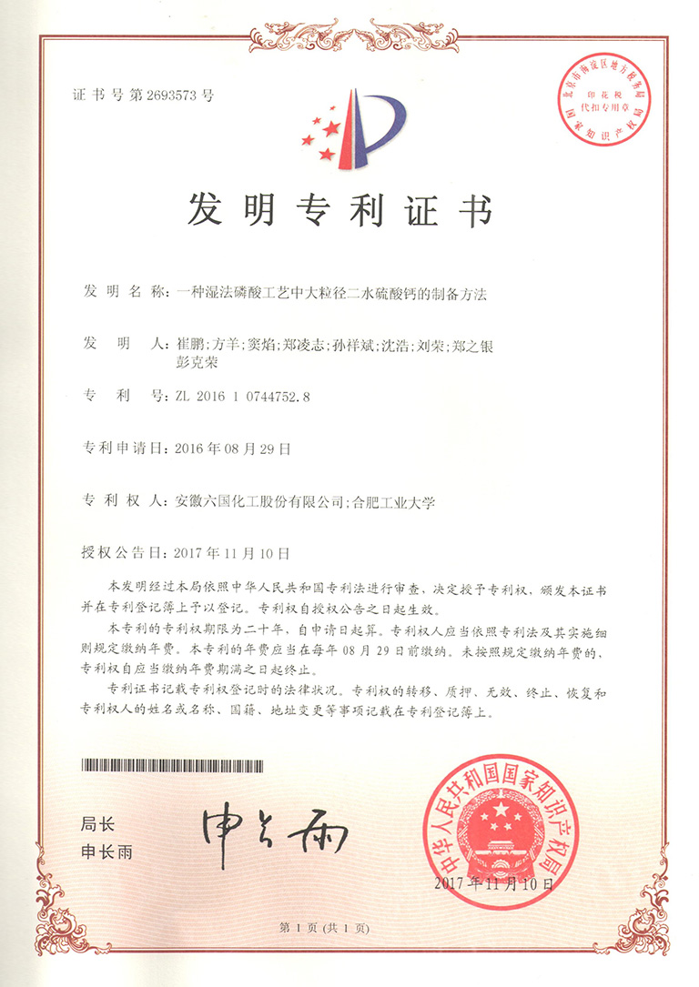 • 2017一種濕法磷酸工藝中大粒徑二水硫酸鈣的制備方法