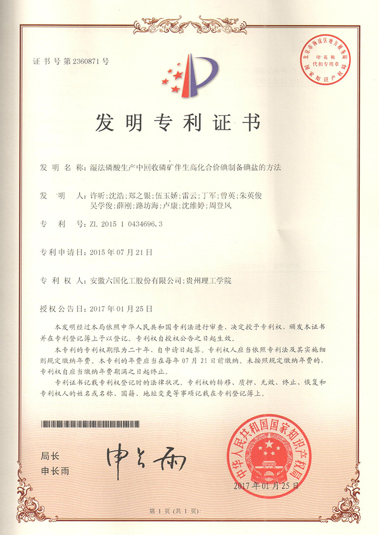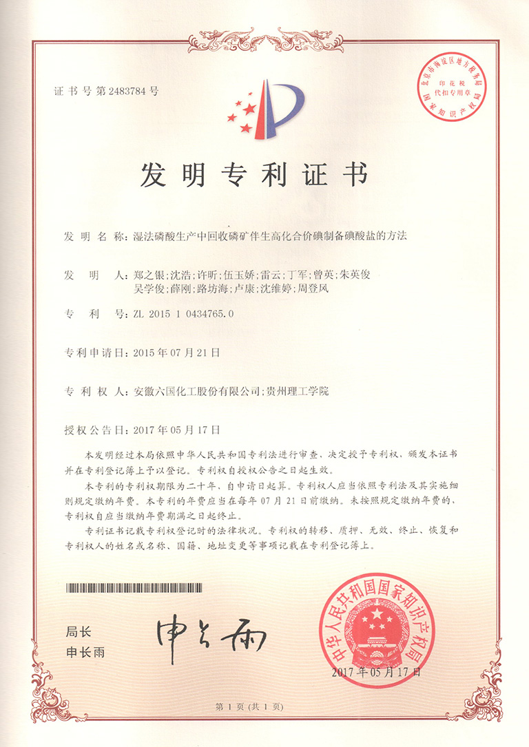 • 2017濕法磷酸生產中回收磷礦伴生高化合價碘制備碘鹽的方法