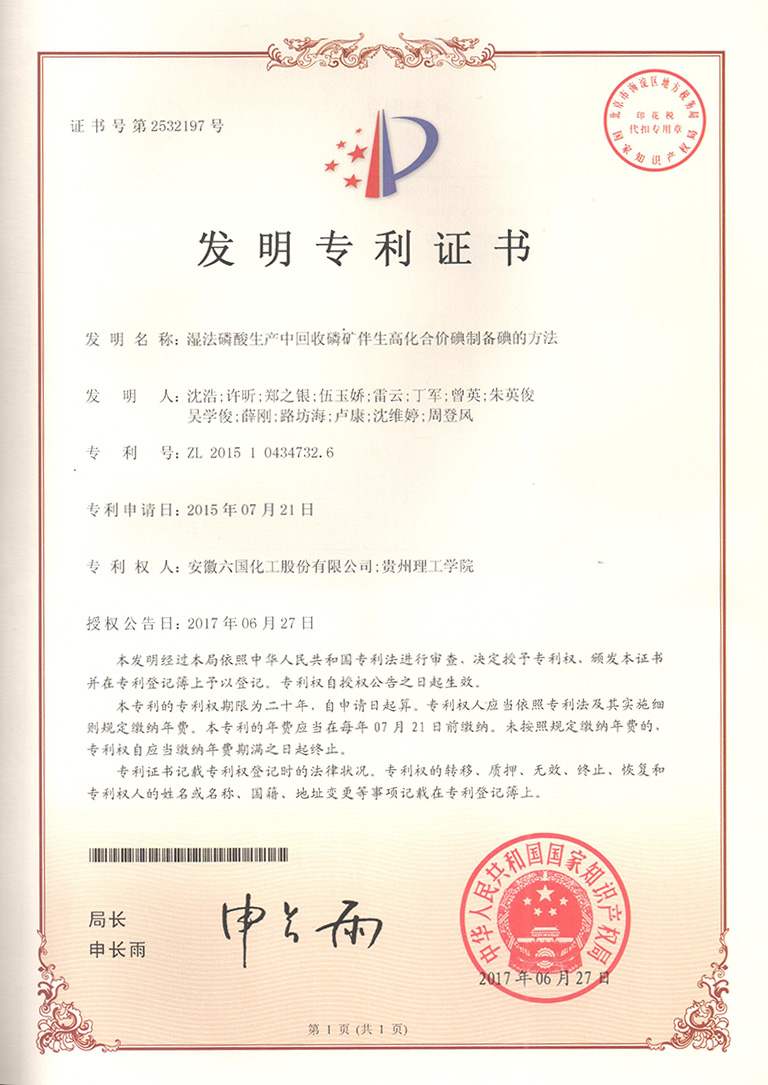 • 2017濕法磷酸生產中回收磷礦伴生高化合價碘制備碘酸鹽的方法1